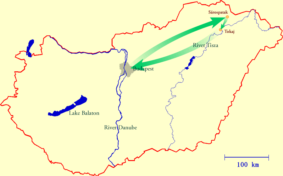 Departure from Budapest to Sárospatak (250 km). |